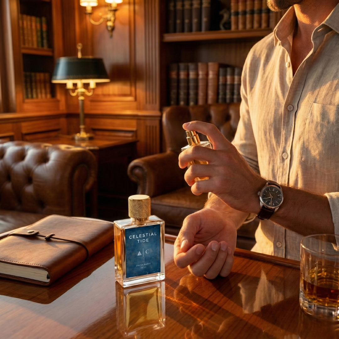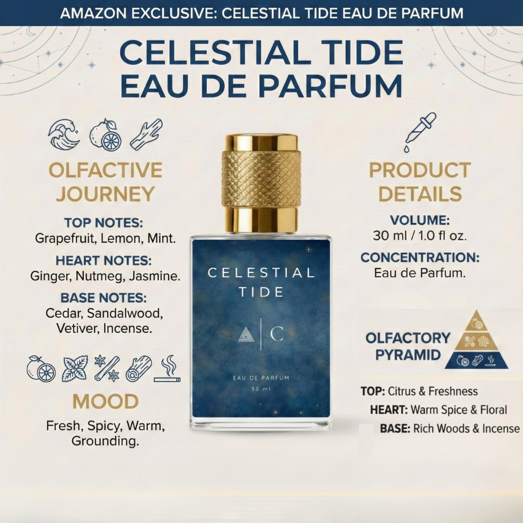 Celestial Tide by Charm Infinia captures the energy of a crisp blue sky and calm ocean breeze in a single spray. Opening with zesty grapefruit, lemon and cooling mint, this fragrance feels like a fresh shower in a bottle. The heart unfolds with warm ginger, nutmeg and subtle jasmine, adding depth and sophistication. In the base, classy cedar, sandalwood, vetiver and a whisper of incense create a smooth, elegant trail that feels both modern and timeless.