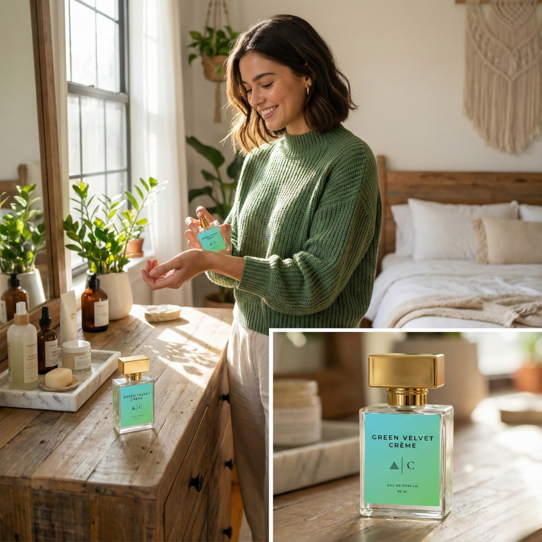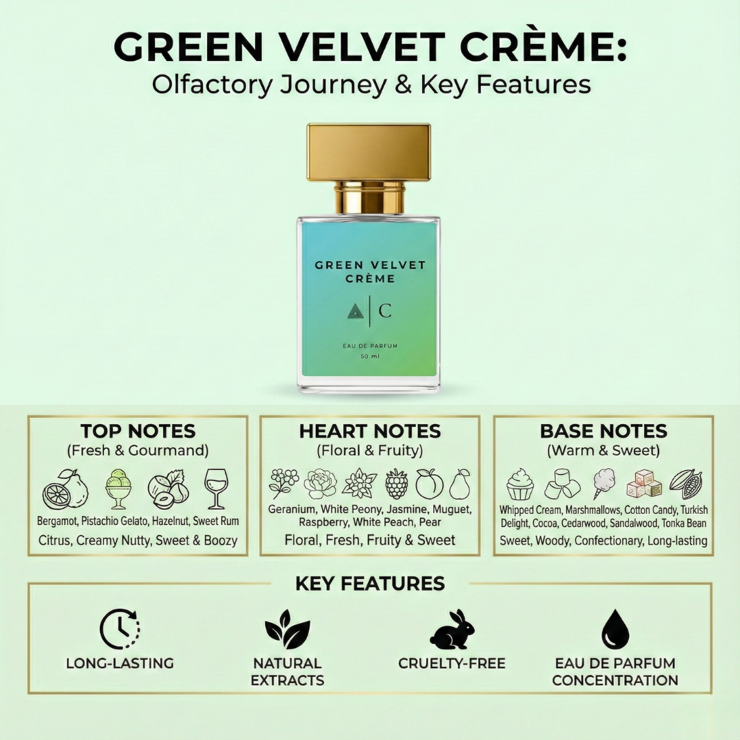 Green Velvet Crème by Charm Infinia is a decadent, dessert-inspired fragrance that smells like a chic patisserie in a bottle. The top is an irresistible mix of pistachio gelato, hazelnut, sweet rum and bergamot – creamy, nutty and slightly boozy. A delicious heart of geranium, white peony, jasmine, muguet, raspberry, white peach and pear adds fruity-floral richness. The base explodes into whipped cream, marshmallow, cotton candy, Turkish delight, cocoa, cedarwood, sandalwood and tonka bean – a full-on gourmand fantasy with a luxurious finish.
