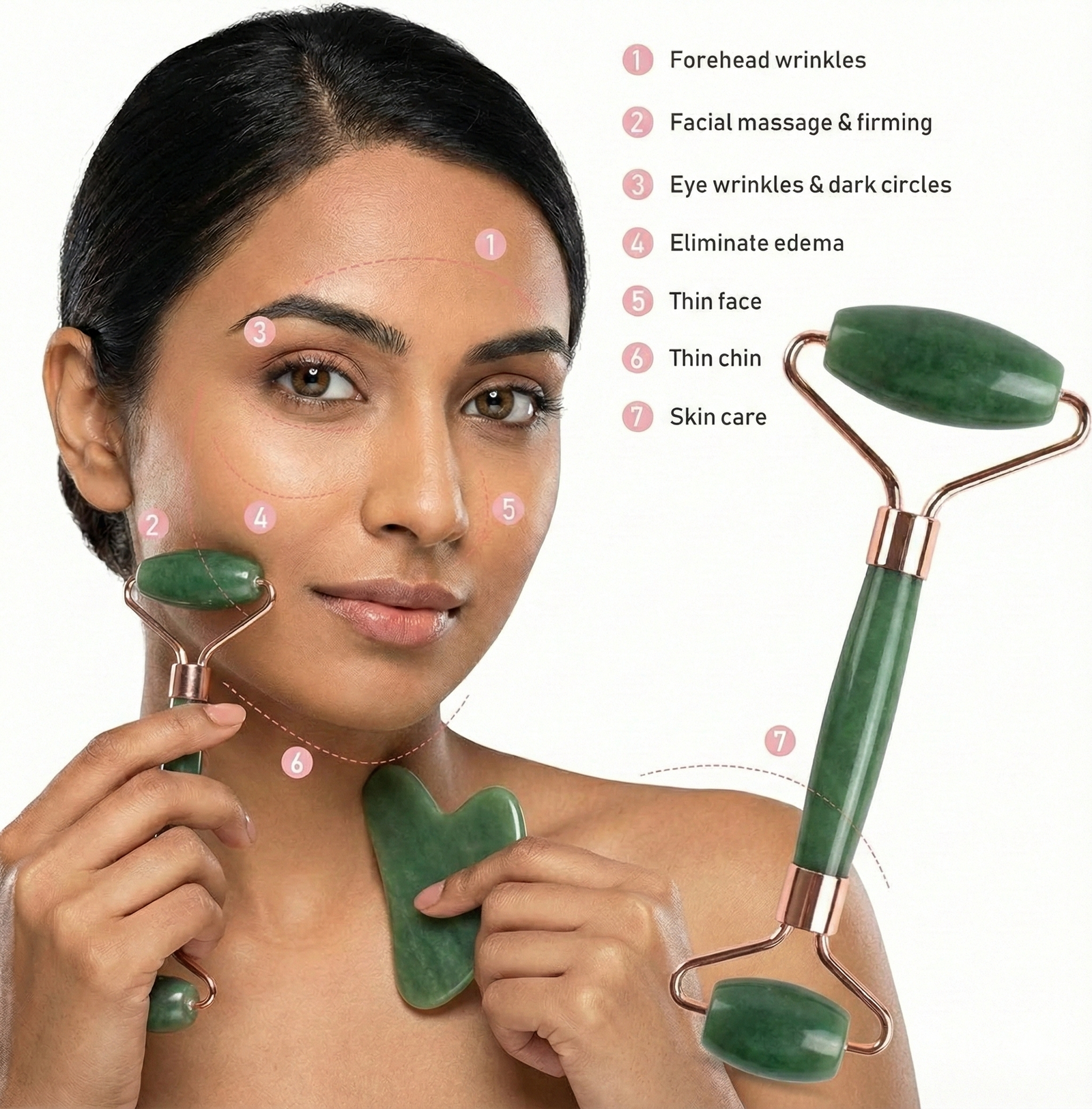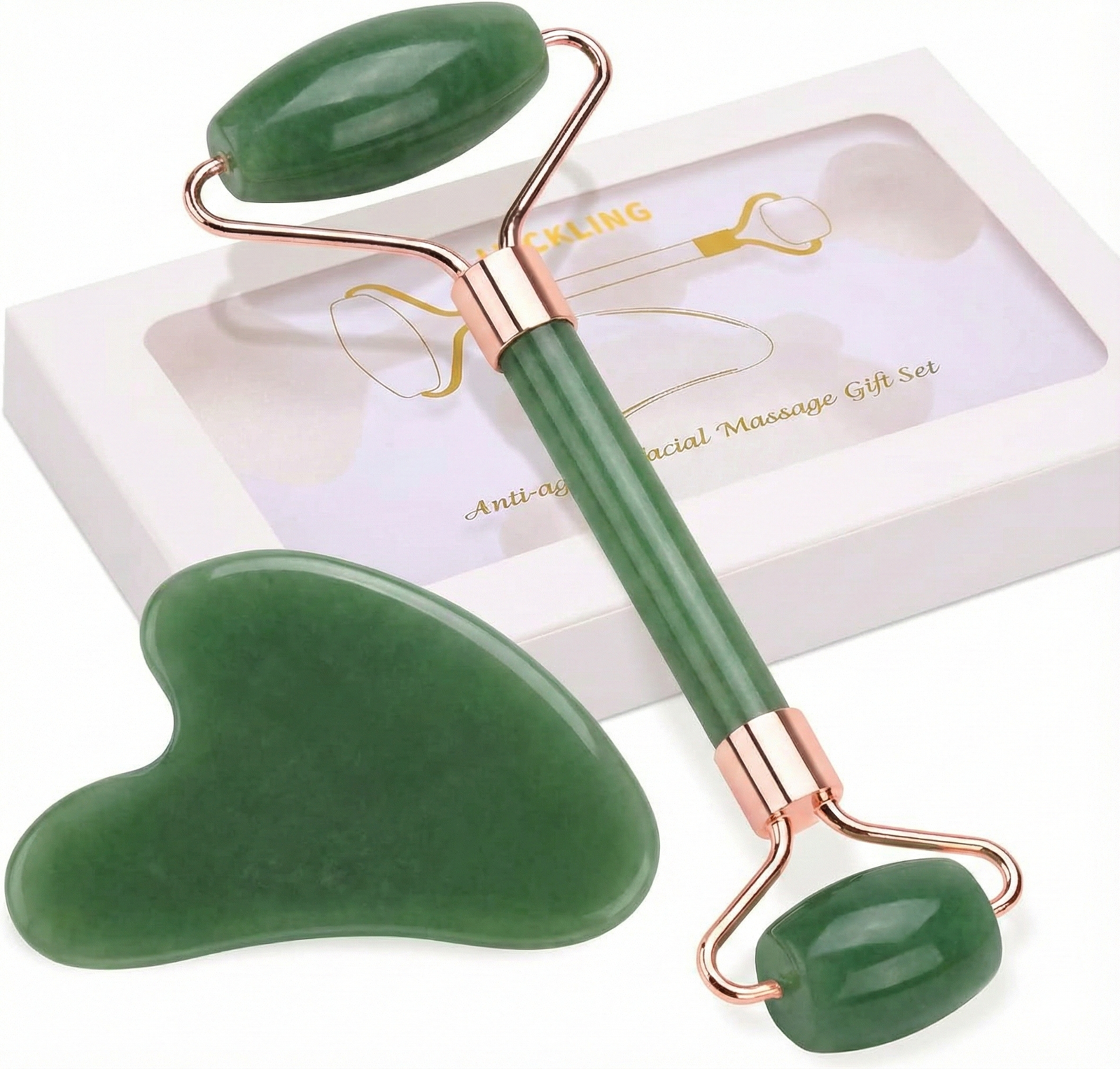 Jade is known as the Stone of Harmony and Balance. Its cooling properties help calm inflammation, tighten pores, and rejuvenate tired skin. Regular use of the jade roller and gua sha improves skin elasticity, enhances product absorption, and leaves the skin looking refreshed and glowing.