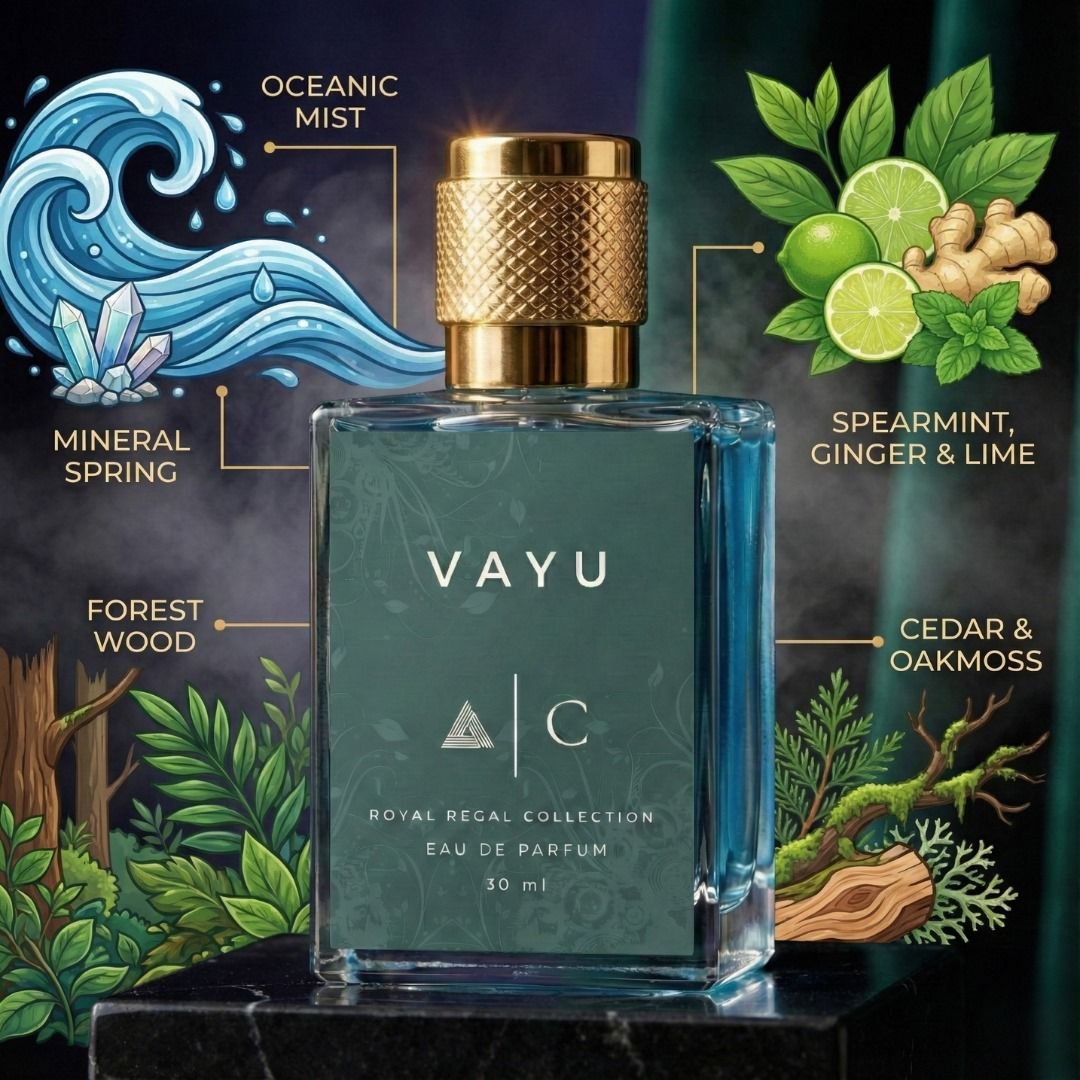 Vayu is inspired by movement, clarity, and freedom. A modern oceanic-mineral fragrance, it captures the sensation of cool air against skin — crisp, energising, and unmistakably masculine.
